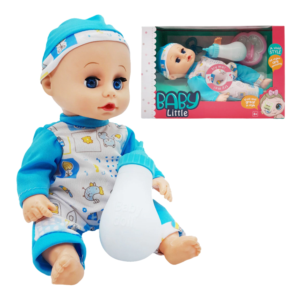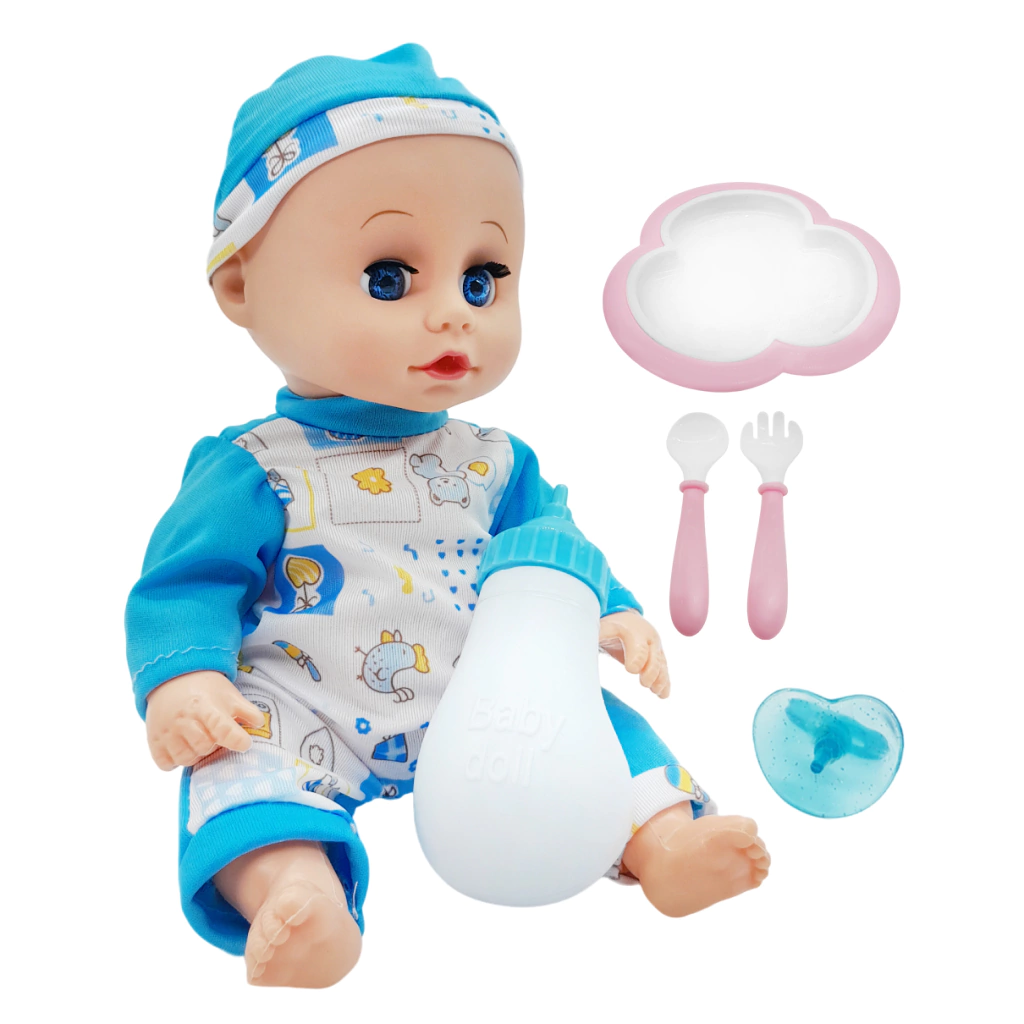 Bebé muñeco, con sonido y accesorios. Presionando la panza, emite variados sonidos, incluso llora. Incluye accesorios: 1 mamadera, 1 chupete, 1 plato, 1 tenedor, 1 cuchara.