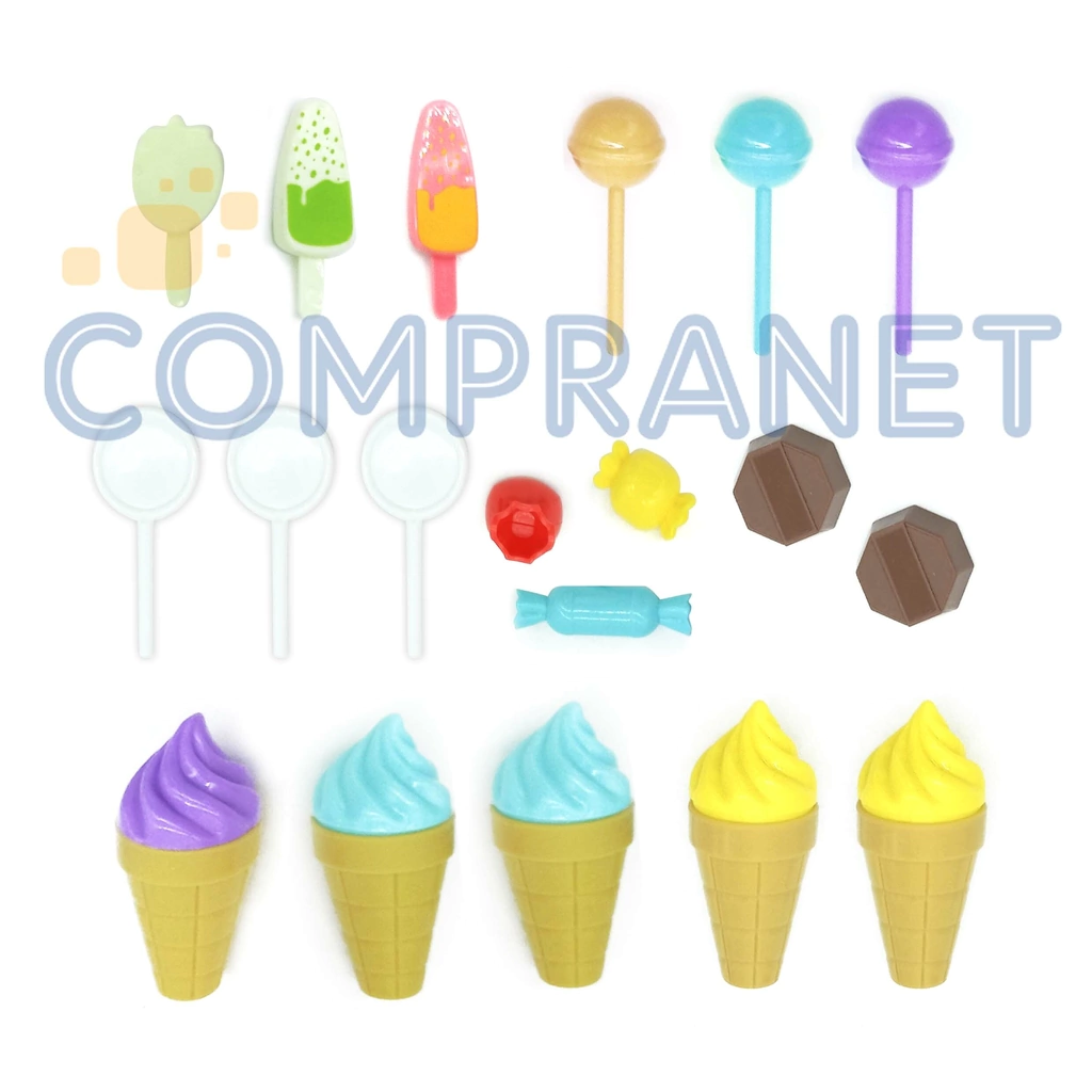 Material: Plástico ABS de alta calidad seguro para el niño. Incluye 30 piezas: palitos de helados, cucuruchos de diferentes colores, chupetines, paletas, caramelos, bombones y calcos para decorar.