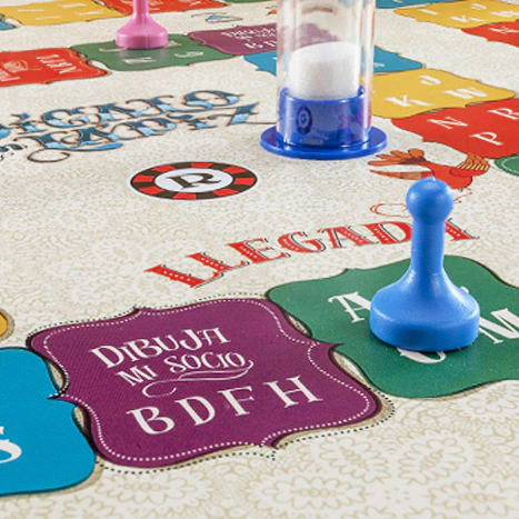 1 tablero de juego, 72 tarjetas bifaz con 2448 palabras, 1 porta-tarjetas, 4 peones, 4 lápices, 4 blocks, 1 ruletra, 1 reloj de arena, 1 reglamento.