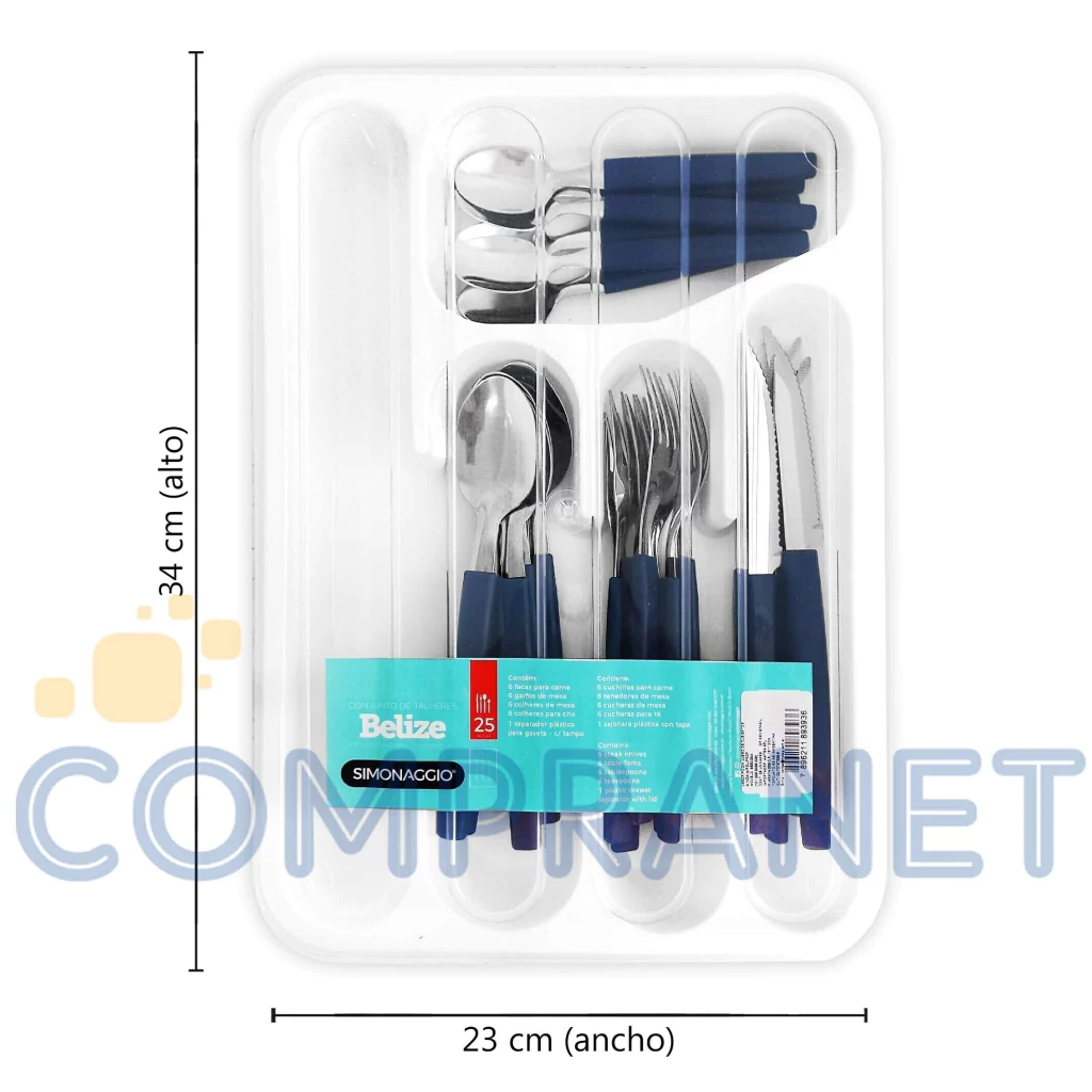 Juego de Cubiertos Simonaggio x 24 con bandeja cubiertera de plástico con tapa transparente.