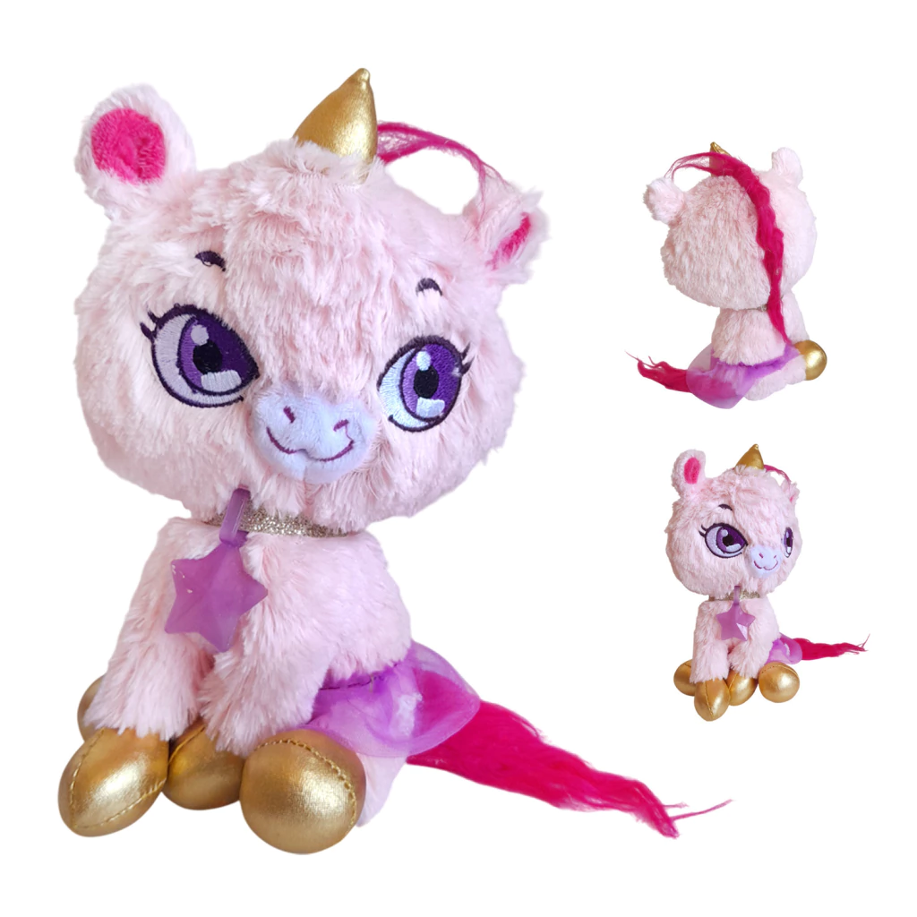 Peluche Unicornio con accesorios y apliques. Este adorable unicornio de peluche invita a las niñas a jugar, peinar, decorar y dejar volar la imaginación. Su diseño con colores vibrantes, detalles brillantes y accesorios para decorarlo, lo convierte en un compañero ideal para quienes disfrutan del mundo de la moda, el maquillaje y la fantasía.
