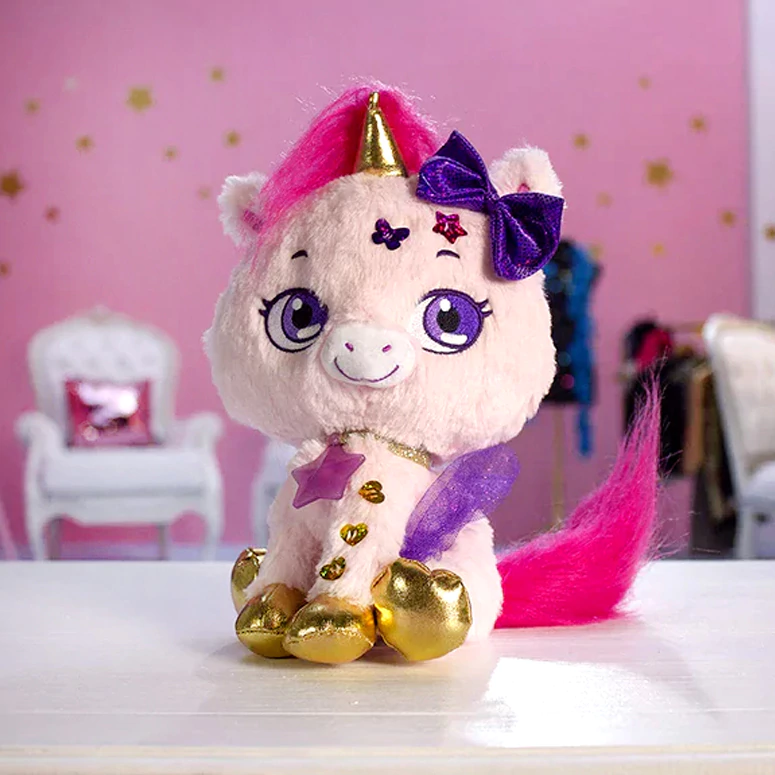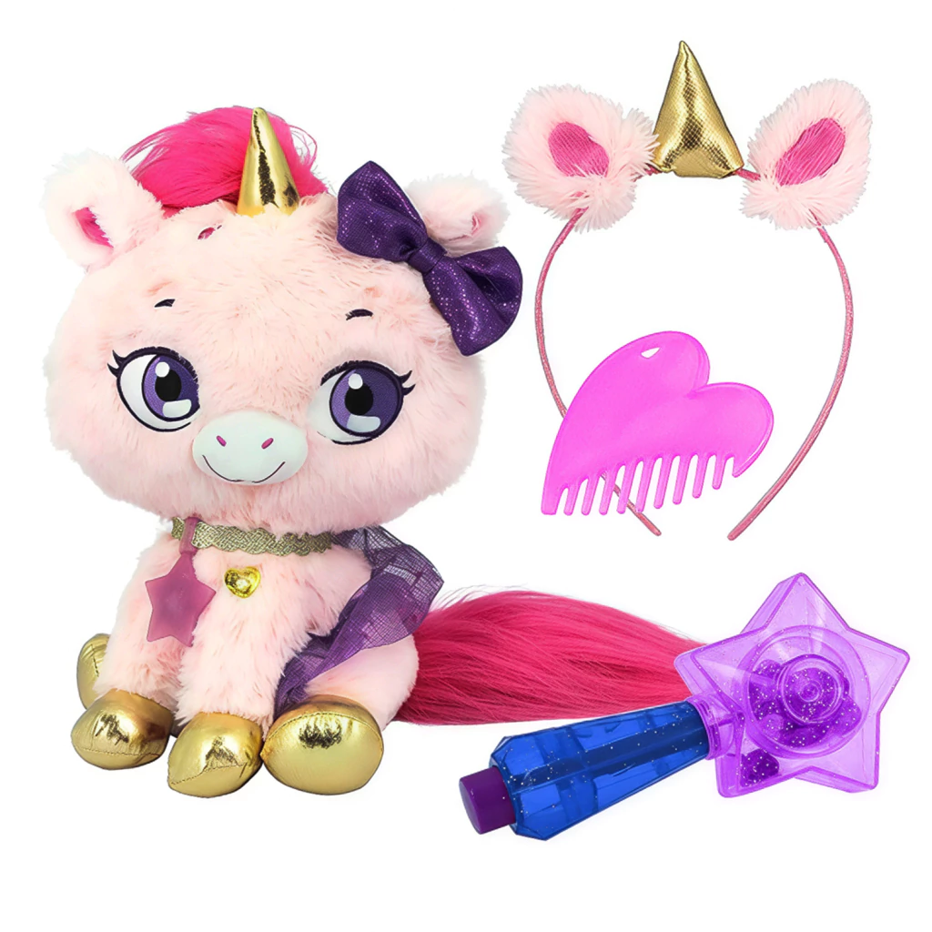 Es suave y abrazable, propone una experiencia interactiva, decorar el peluche unicornio o tu propio pelo con los apliques brillosos que se encuentran en la varita mágica. Los brillos son reutilizables. No tienen pegamento, no ensucian y funcionan en todo tipo de cabello.