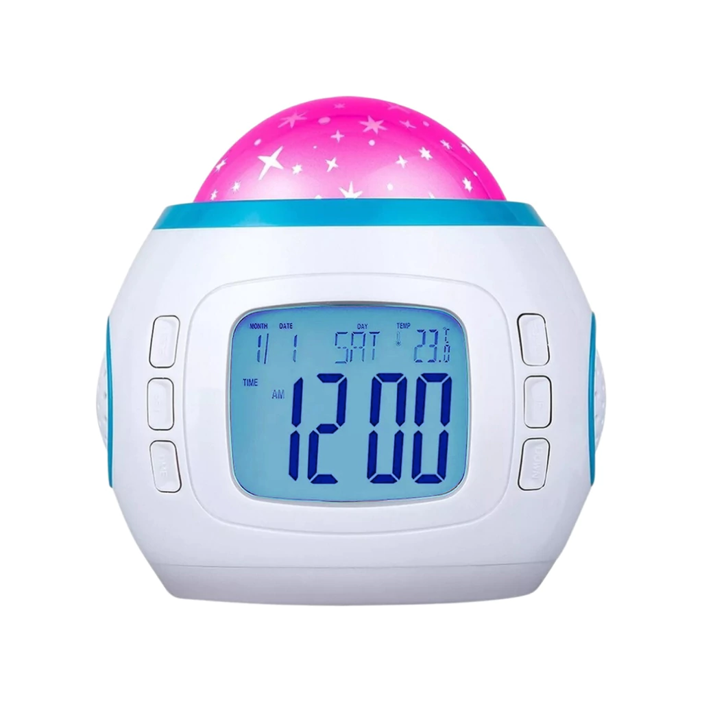 Reloj despertador con Luz y Proyector de estrellas, con alarma y luces led. Combina funcionalidad y diseño. Proyecta luces en el techo, creando un efecto estrellado, e incluye una pantalla digital que muestra la hora, la fecha, día (en idioma inglés) y la temperatura. Además, cuenta con alarma para un despertar puntual.